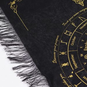 Tissu de divination noir et or avec symbole de l’Œil mystique et cercle zodiacal. Idéal pour pendule, tirages et espace spirituel élégant.