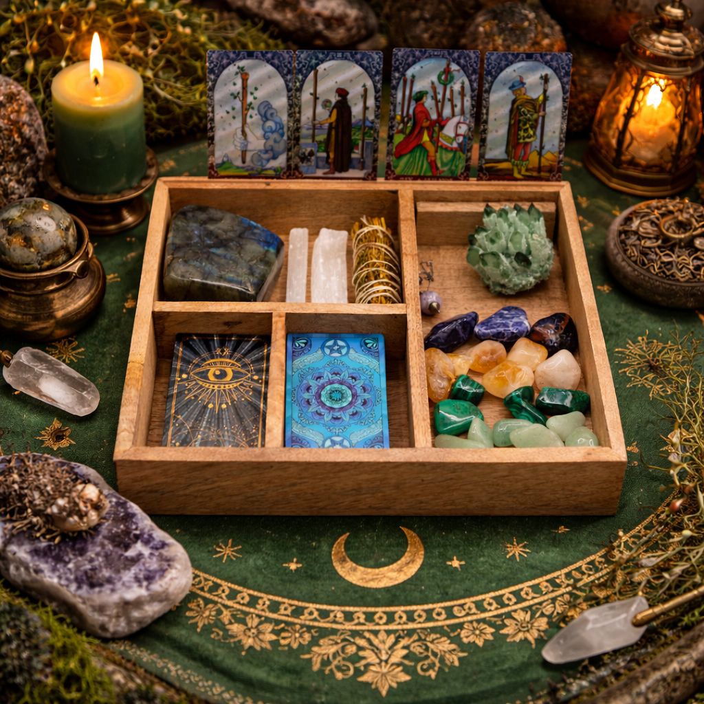 Une boîte à tarot en bois avec 4 compartiments et porte-cartes intégré, idéale pour organiser vos cartes, cristaux et accessoires spirituels en un seul espace.