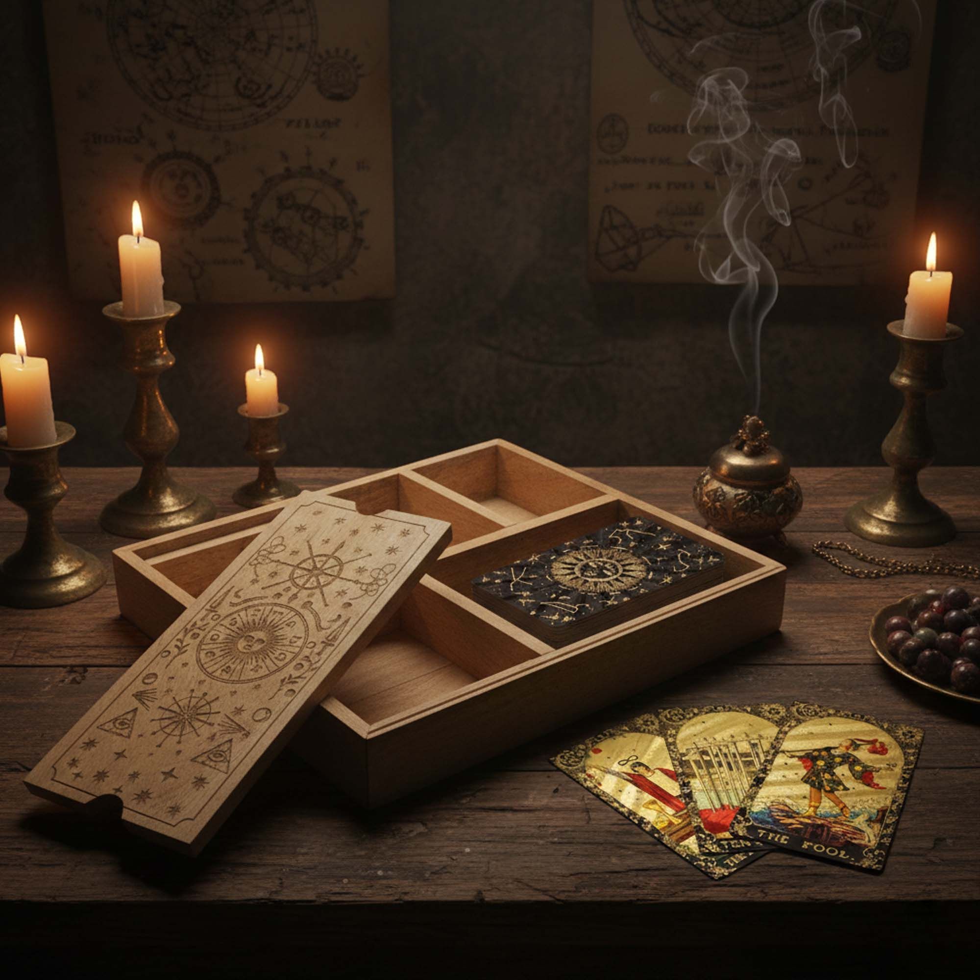 Une boîte à tarot en bois gravé avec 4 compartiments et porte-cartes intégré, idéale pour organiser vos cartes et accessoires tout en apportant une touche mystique à votre espace.