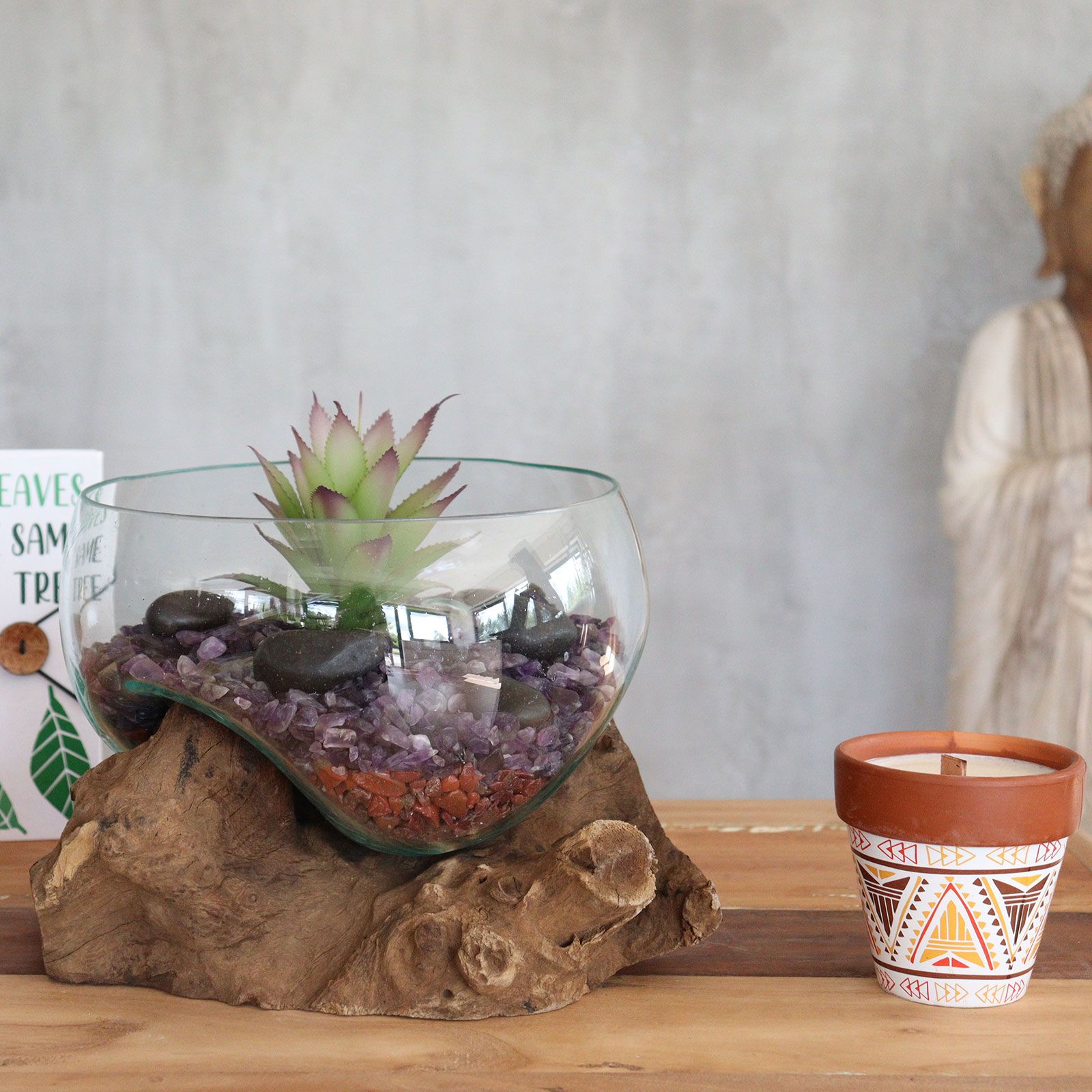 Un superbe bol en verre fondu façonné à la main sur du bois naturel balinais.
